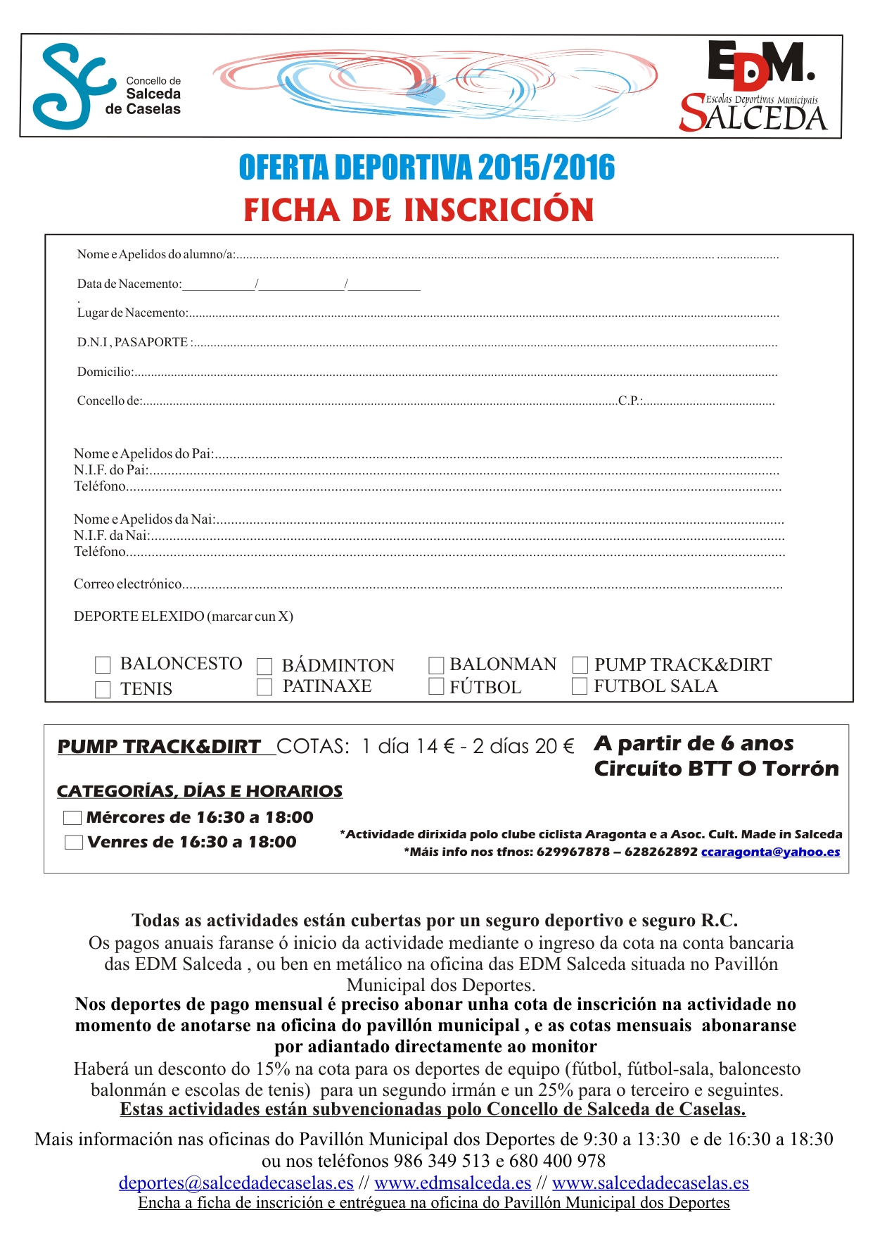 Podes consultar toda a información (reservas, prezos, tallas, etc) no enlace adxunto, pasando pola oficina das EDM situada no pavillón municipal dos deportes ou chamando ao teléfono 986 349 513.